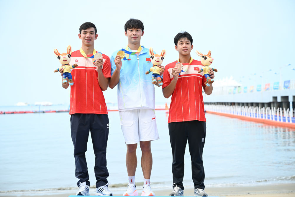 4月26日,冠军中国选手张子扬(中)、亚军越南选手阮辉黄(左)和季军越南选手梅陈俊安在颁奖仪式上。新华社记者 贝赫 摄