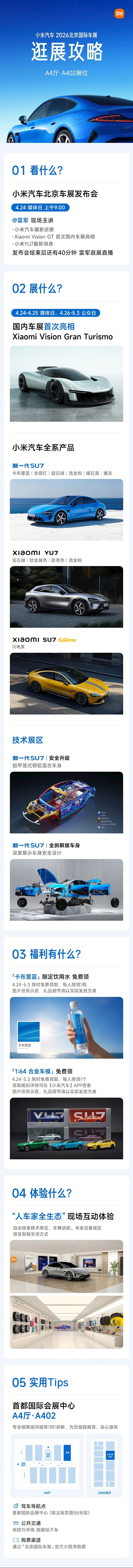 4月24日媒体日上午9点,雷军会在小米展台主讲发布会,公布小米汽车最新进展,Xiaomi Vision GT也会在国内车展首次亮相,同时还会发布YU7的最新消息。